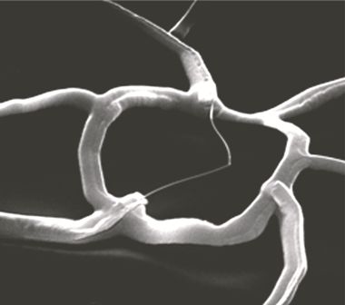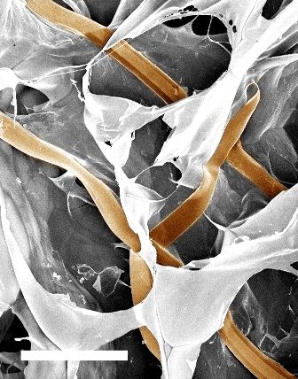 Artificial cell tissue grown with embedded wiring opens way for 'cyborg' organisms10 September 2012 A team from Harvard University and MIT has developed a method of growing artificial tissue on a 3D structure of microscopic electrical wires. This is the first time that electronics and artificial tissue have been truly merged in 3D, allowing direct sensing and potentially stimulation of the tissue. It could lead to the development of engineered tissues that incorporate capabilities for monitoring and stimulation, and of devices for screening new drugs. The team, from the Department of Anesthesia at Boston Children's Hospital, Harvard University, and the Massachusetts Institute of Technology, reported its results online on August 26 2012 in Nature Materials. One of the major challenges in developing bioengineered tissues is creating systems to sense what is going on (eg chemically and electrically) within a tissue after it has been grown and/or implanted. Similarly, researchers have struggled to develop methods to directly stimulate engineered tissues and measure cellular reactions. "In the body, the autonomic nervous system keeps track of pH, chemistry, oxygen and other factors, and triggers responses as needed," Daniel Kohane of Boston Children's Hospital explained. "We need to be able to mimic the kind of intrinsic feedback loops the body has evolved in order to maintain fine control at the cellular and tissue level." The team built mesh-like networks of nanoscale silicon wires — about 80 nm in diameter — shaped like flat planes or in a "cotton-candy" like reticular conformation. The networks were porous enough to allow seeding with cells and encourage those cells to grow in 3D cultures.