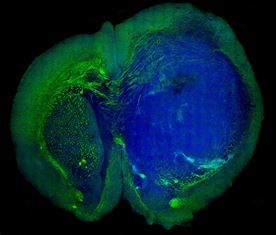 Raman laser highlights tumour cells in brain tissue during surgery10 September 2013 A new laser-based technology can identify cancerous cells during surgery, enabling surgeons to make sure they remove all the cells that could develop into a new tumour. In a paper published in the journal Science Translational Medicine, a team of researchers from the University of Michigan Medical School and Harvard University describes how the technique allows them to identify the tiniest areas of tumour cells in brain tissue. The basic technique used, stimulated Raman scattering (SRS), is named after CV Raman, one of the Indian scientists who co-discovered the effect and shared a 1930 Nobel Prize in physics for it. SRS can detect a weak light signal that comes out of a material after it’s hit with light from a non-invasive laser. The spectrum of light that is emitted by the sample gives details of its chemical makeup. Over the past 15 years, Dr Sunney Xie of the Department of Chemistry and Chemical Biology at Harvard University has advanced the technique for high-speed chemical imaging. By amplifying the weak Raman signal by more than 10,000 times, it is now possible to make multicolour SRS images of living tissue or other materials. The team can even make 30 new images every second, the rate needed to create videos of the tissue in real time. The team used this technique to distinguish tumour from healthy tissue in the brains of living mice and then showed that the same was possible in tissue removed from a patient with glioblastoma multiforme, one of the most deadly brain tumours. Now, the team is working to develop the approach, called SRS microscopy, for use during surgery to guide them in removing tissue, and test it in a clinical trial. The need for a better solution On average, patients diagnosed with glioblastoma multiforme live only 18 months after diagnosis. Surgery is one of the most effective treatments for such tumours, but less than a quarter of patients’ operations achieve the best possible results. “Though brain tumour surgery has advanced in many ways, survival for many patients is still poor, in part because surgeons can’t be sure that they’ve removed all tumour tissue before the operation is over,” says co-lead author Daniel Orringer MD, a lecturer in the University of Michigan Department of Neurosurgery. “We need better tools for visualizing tumour during surgery, and SRS microscopy is highly promising,” he continues. “With SRS we can see something that’s invisible through conventional surgical microscopy.” Highlighting the tumour The new paper describes the first time SRS microscopy has been used in a living organism to see the “margin” of a tumour — the boundary area where tumour cells infiltrate among normal cells. That’s the hardest area for a surgeon to operate, especially when a tumour has invaded a region with an important function. As the image shows, the technique can distinguish brain tumour from normal tissue with remarkable accuracy, by detecting the difference between the signal given off by the dense cellular structure of tumour tissue, and the normal healthy grey and white matter.