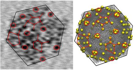 The newly developed method involves a chemical modification of a known thiol-stabilized gold nanoparticle, the so-called Au102 cluster that was first synthesized and structurally solved by the group of Roger D Kornberg in 2007 (4) and later characterized at NSC by the groups of prof. Hannu Häkkinen and prof. Mika Pettersson in collaboration with Kornberg. (5) The organic thiol surface of the Au102 particles is modified by attaching linker molecules that make a chemical bond to sulfur-containing cysteine residues that are part of the surface structure of the virus. Several tens of gold particles can bind to a single virus, and the binding pattern shows up as dark tags reflecting the overall shape and structure of the virus (see the figure). The gold particles allow for studies on the structural changes of the viruses during their lifespan. The study showed also that the infectivity of the viruses is not compromised by the attached gold particles which indicates that the labeling method does not interfere with the normal biological functions of viruses inside cells. This facilitates new investigations on the virus structures from samples taken from inside cells during the various phases of the virus infection, and gives possibilities to obtain new information on the mechanisms of virus uncoating (opening and release of the genome). The new method allows also for tracking studies of virus pathways in tissues. This is important for further understanding of acute and chronic symptoms caused by viruses. Finally, the method is expected to be useful for developing of new antiviral vaccines that are based on virus-like particles. References